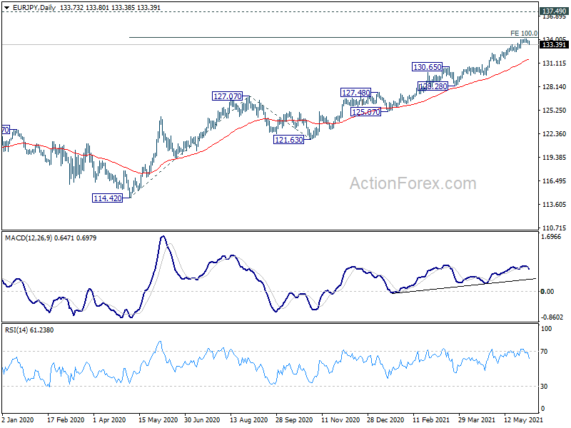 EUR/JPY’s pull back extends lower today but stays well above 132.51 support. Intraday bias remains neutral for the moment, and further rally is still expected. On the upside, sustained break of 100% projection of 114.42 to 127.07 from 121.63 at 134.28, will extend the up trend from 114.42 to 137.49 long term resistance next. On the downside, however, firm break of 132.51 will indicate short term topping and bring deeper pull back.