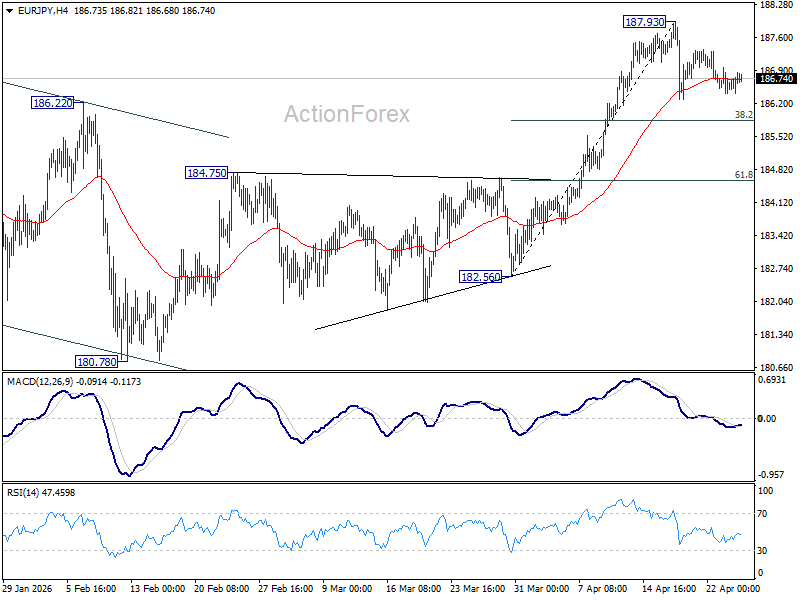 EUR/JPY is staying in consolidations below 187.93 and intraday bias remains neutral. Another fall might be seen to 38.2% retracement of 182.56 to 187.93 at 185.87. But strong support would be seen there to bring rebound. On the upside, though, break of 187.93 will resume larger up trend.