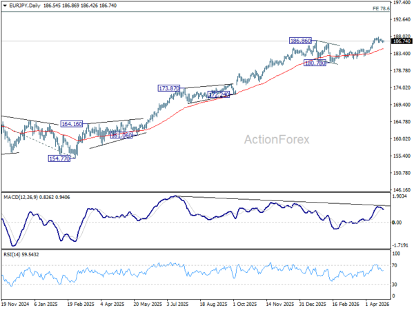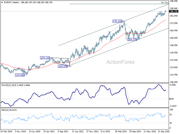 In the bigger picture, up trend from 114.42 (2020 low) is in progress. Next target is 78.6% projection of 124.37 (2022 low) to 175.41 (2025 high) from 154.77 at 194.88 next. For now, medium term outlook will stay bullish as long as 180.78 support holds, even in case of deeper pullback.