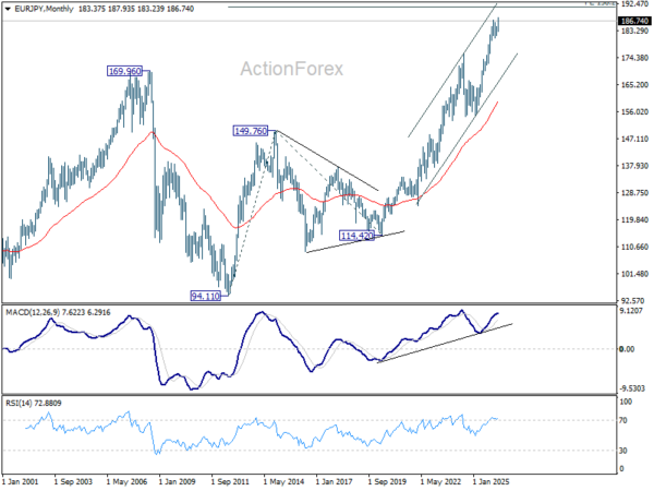 In the bigger picture, up trend from 114.42 (2020 low) is in progress Next target is 78.6% projection of 124.37 (2022 low) to 175.41 (2025 high) from 154.77 at 194.88 next. For now, medium term outlook will stay bullish as long as 180.78 support holds, even in case of deeper pullback.