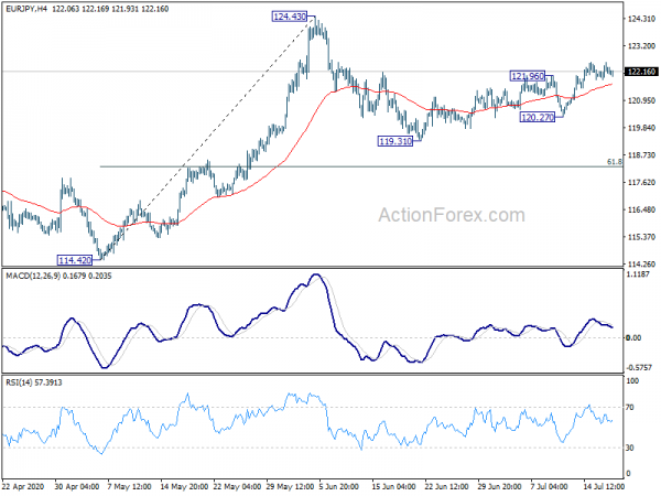 In the bigger picture, whole down trend from 137.49 (2018 high) could have completed at 114.42 already. Rise from 114.42 would target 61.8% retracement of 137.49 to 114.42 at 128.67 next. Sustained break there will pave the way to 137.59 (2018 high). This will remain the preferred case for now, as long as 55 day EMA (now at 121.32) holds. However, sustained break of 55 day EMA will revive medium term bearishness for another low below 114.42 at a later stage.