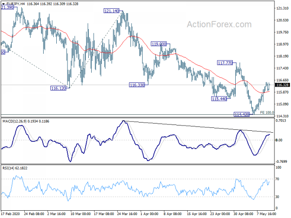 EUR/JPY’s rise from 114.42 extended to as high as 119.90 last week. Initial bias remains on the upside this week. Such rise is seen as at least correcting the fall from 122.87 Further rise should be seen to 121.14 resistance next. Sustained break there will target 122.87 key resistance next. On the downside, below 118.85 minor support will turn intraday bias neutral first. But further rise will remain in favor as long as 117.11 support holds.
