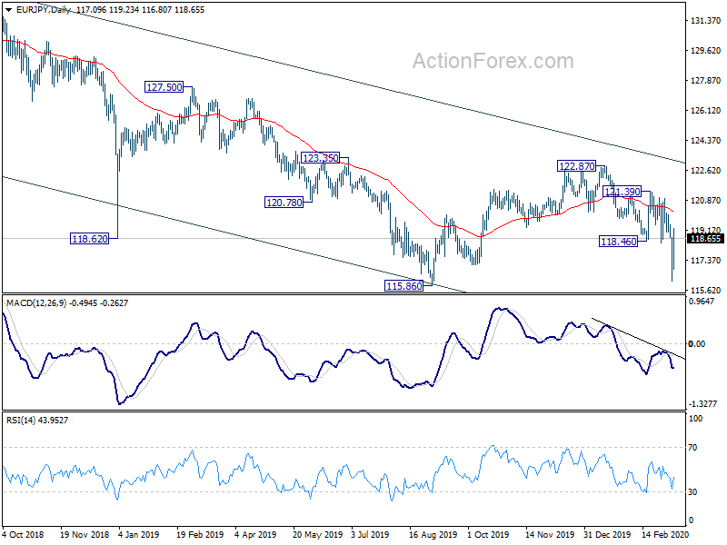 In the bigger picture, outlook remains bearish as the cross is staying well inside falling channel established since 137.49 (2018 high). As long as 122.87 resistance holds, the down trend should resume sooner or later to 114.84 support next. However, sustained break of 122.87 will complete a double bottom (115.86, 116.12) which could indicate medium term bullish reversal.