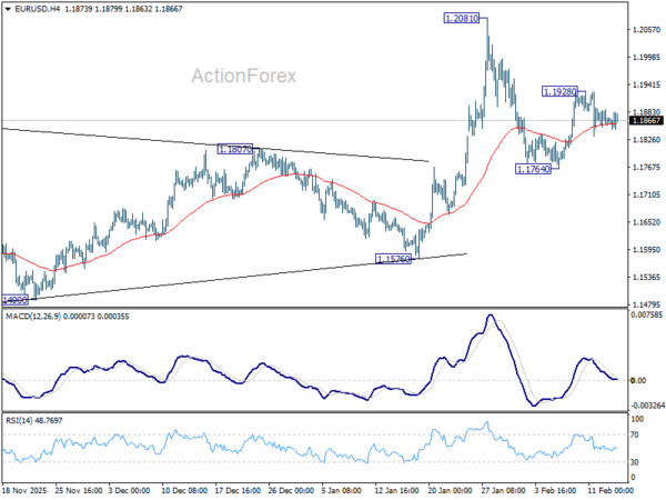 EUR/USD recovers mildly from 55 4H EMA but stays in established tight range. Intraday bias remains neutral. On the upside, above 1.1928 will target a retest on 1.2081 high. Decisive break there and sustained trading above 1.2 psychological level will carry larger bullish implications. On the downside, however, sustained trading below 55 D EMA (now at 1.1756) will raise the chance of reversal on rejection by 1.2, and target 1.1576 support for confirmation.