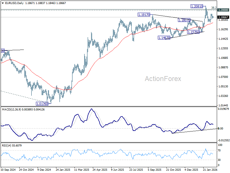 Intraday bias in EUR/USD stays neutral and outlook is unchanged. On the upside, above 1.1928 will target a retest on 1.2081 high. Decisive break there and sustained trading above 1.2 psychological level will carry larger bullish implications. On the downside, however, sustained trading below 55 D EMA (now at 1.1756) will raise the chance of reversal on rejection by 1.2, and target 1.1576 support for confirmation.