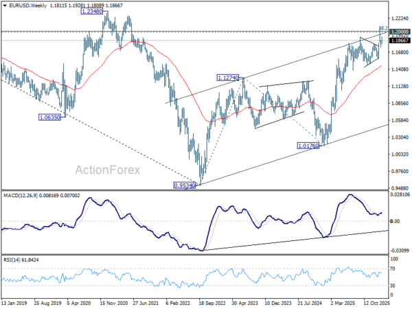 In the bigger picture, as long as 55 W EMA (now at 1.1471) holds, up trend from 0.9534 (2022 low) is still in favor to continue. Decisive break of 1.2 key psychological level will add to the case of long term bullish trend reversal. Next medium term target will be 138.2% projection of 0.9534 to 1.1274 from 1.0176 at 1.2581. However, sustained trading below 55 W EMA will argue that rise from 0.9534 has completed as a three wave corrective bounce, and keep long term outlook bearish.