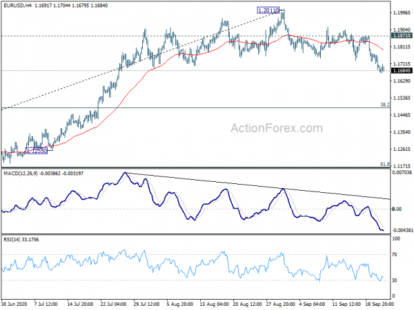 EUR/USD’s fall from 1.2011 is still in progress and intraday bias remains on the downside for 38.2% retracement of 1.0635 to 1.2011 at 1.1485. Such decline is seen as a corrective move for now. Thus, we’d look for strong support from 1.1485 to contain downside and bring rebound. However, sustained break there will pave the way to 61.8% retracement at 1.1485. On the upside, above 1.1760 minor resistance will turn intraday bias neutral first.