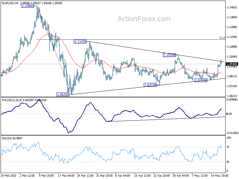EUR/USD’s rise from 1.0774 is still in progress and intraday bias remains on the upside. Corrective pattern from 1.0635 is in another rising leg. Further rally could be seen to 1.1019 resistance and above. But still, upside should be limited by 61.8% retracement of 1.1496 to 1.0635 at 1.1167. On the downside, break of 1.0774 should turn bias back to the downside for retesting 1.0635 low.
