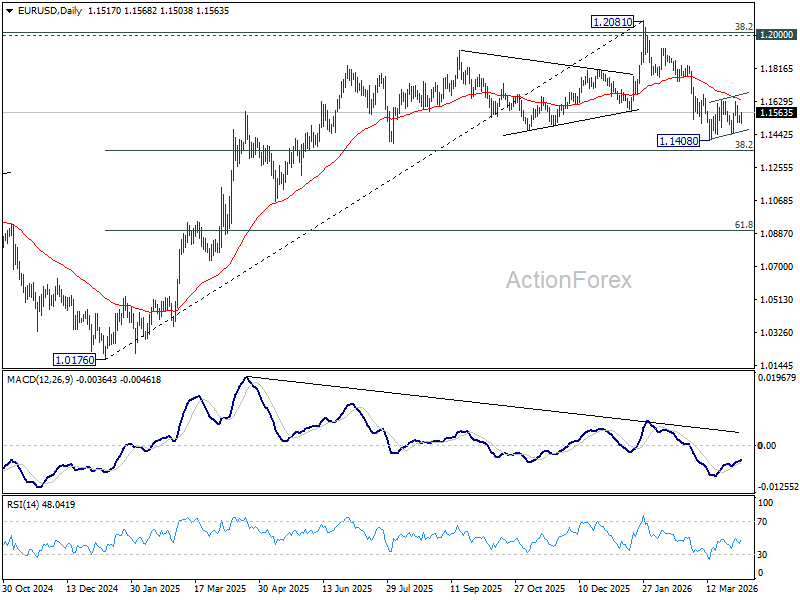 Intraday bias in EUR/USD remains neutral and more consolidations would be seen above 1.1408. With 1.1666 cluster resistance (38.2% retracement of 1.2081 to 1.1408 at 1.1665) intact, further decline is expected. On the downside, firm break of 1.1408 will resume the fall from 1.2081 to 38.2% retracement of 1.0176 to 1.2081 at 1.1353. However, decisive break of 1.1666 will argue that the fall from 1.2081 has completed, and turn bias back to the upside for 61.8% retracement of 1.2081 to 1.1408 at 1.1824.