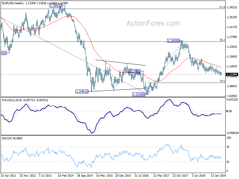 EUR/USD dropped to 1.1107 last week and breached 1.1111 low but quickly recovered. The development suggests that consolidation from 1.1111 is extending. Initial bias remains neutral this week first for more sideway trading. Upside of recovery should be limited by 1.1263 resistance to bring down trend resumption. On the downside, firm break of 1.1107 will target 100% projection of 1.1448 to 1.1183 from 1.1324 at 1.1059. However, sustained break of 1.1263 resistance will now be an early sign of trend reversal and turn bias to the upside for 1.1448 key resistance.