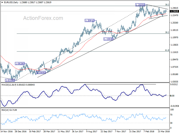 In the bigger picture, key fibonacci level at 38.2% retracement of 1.6039 (2008 high) to 1.0339 (2017 low) at 1.2516 remains intact despite attempts to break. Firm break of 1.2154 support will confirm rejection by this fibonacci level. And in that case, a medium term top is at least formed at 1.2555. EUR/USD should then head back to 38.2% retracement of 1.0339 to 1.2555 at 1.1708 first. We’ll look at the structure and momentum of such decline before decision if it’s an impulsive or corrective move.