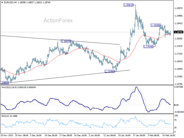 EUR/USD recovers mildly from 55 4H EMA but stays in established tight range. Intraday bias remains neutral. On the upside, above 1.1928 will target a retest on 1.2081 high. Decisive break there and sustained trading above 1.2 psychological level will carry larger bullish implications. On the downside, however, sustained trading below 55 D EMA (now at 1.1756) will raise the chance of reversal on rejection by 1.2, and target 1.1576 support for confirmation.