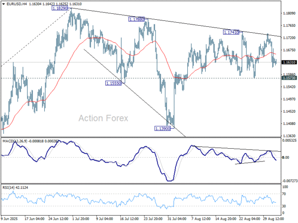 In the bigger picture, rise from 0.9534 (2022 low) long term bottom could be correcting the multi-decade downtrend or the start of a long term up trend. In either case, further rise should be seen to 100% projection of 0.9534 to 1.1274 from 1.0176 at 1.1916. This will remain the favored case as long as 1.1604 support holds.