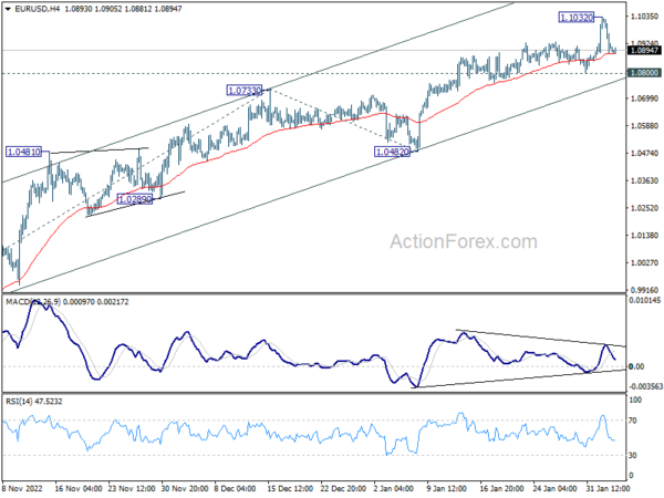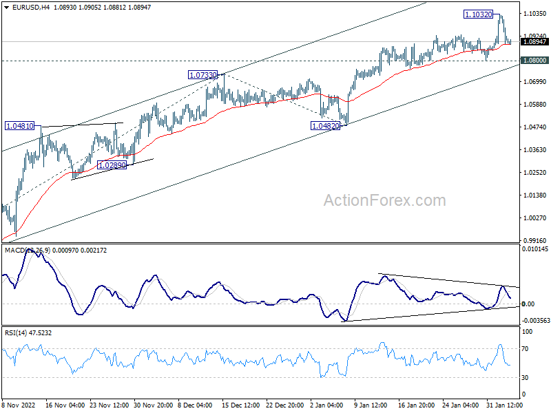 Intraday bias in EUR/USD is turned neutral again with current retreat. Further rally will remain in favor as long as 1.0800 minor support holds. Break of 1.1032 will resume the up trend from 0.9534, and target 61.8% projection of 0.9630 to 1.0733 from 1.0482 at 1.1164 next. Nevertheless, break of 1.0800 should confirm short term topping and turn bias back to the downside for deeper correction towards 1.0482 support.