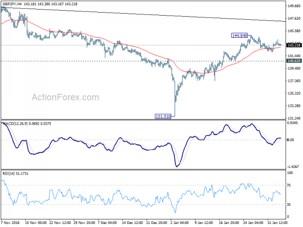 At this point, further rise is in favor in GBP/JPY. But we’d expect strong resistance from trend line (now at 146.64) to limit upside, at least on first attempt. On the downside, firm break of 141.00 support will suggest completion of the rebound and turn bias to the downside.