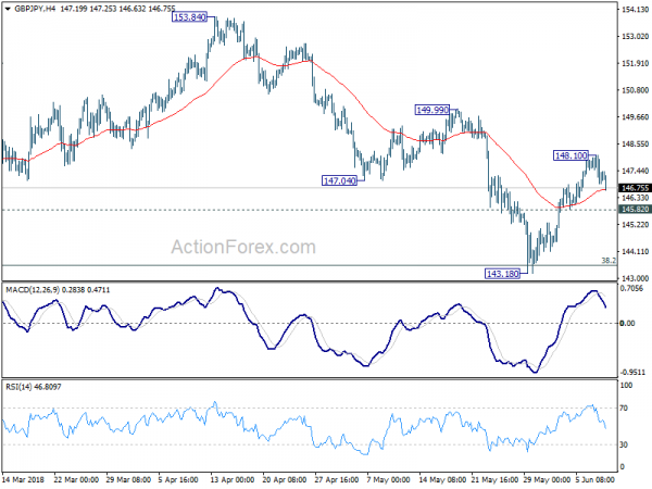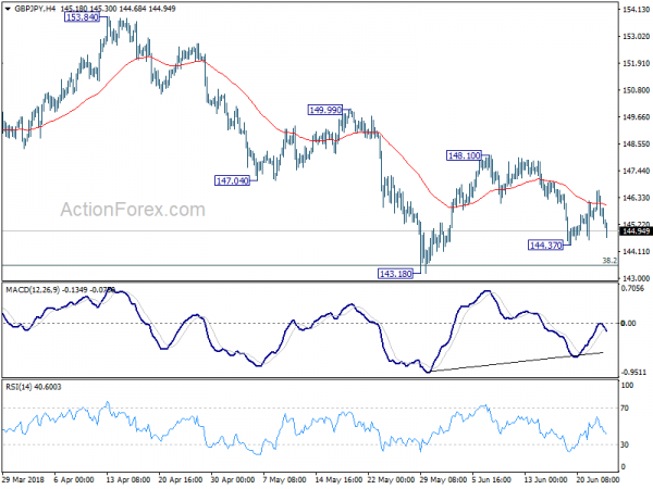 Intraday bias in GBP/JPY remains neutral at this point. On the downside, below 144.37 will target 143.18 first. Break will resume larger decline from 156.59 and target 139.25/47 cluster support level. However, break of 148.10 will resume the rebound from 143.18 and that will also be the first sign of near term reversal.