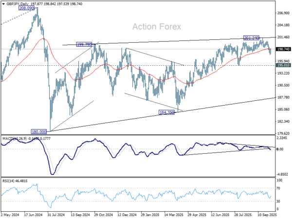 In the bigger picture, price actions from 208.09 (2024 high) are seen as a corrective pattern which might have completed at 184.35. Firm break of 208.09 high will resume the up trend from 123.94 (2020 low). Next target is 61.8% projection of 148.93 to 208.09 from 184.35 at 220.90. However, decisive break of 197.47 will dampen this view and could extend the corrective pattern with another fall.
