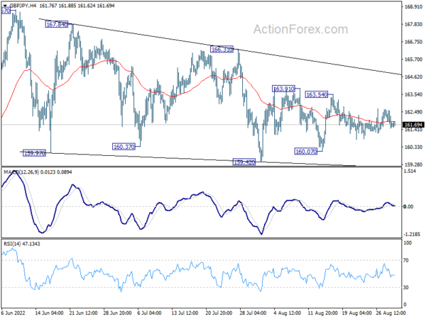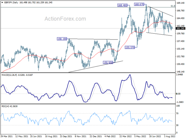 In the bigger picture, up trend from 123.94 (2020 low) is still in progress. Sustained break of 61.8% retracement of 195.86 (2015 high) to 122.75 (2016 low) at 167.93 will be a long term bullish signal, and could pave the way back to 195.86 high. This will remain the favored case as long as 155.57 support holds, even in case of deep pull back.