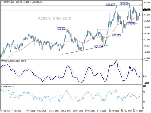 In the bigger picture, up trend from 123.94 (2020 low) is still in progress. Sustained break of 61.8% retracement of 195.86 (2015 high) to 122.75 (2016 low) at 167.93 will be a long term bullish signal, and could pave the way back to 195.86 high. This will now remain the favored case as long as 155.57 support holds, even in case of deep pull back.