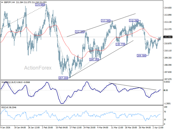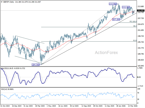 Intraday bias in GBP/JPY stays neutral first, and risk remains on the downside with 213.29 resistance intact. Corrective pattern from 214.98 should be in the third leg. Break of 209.58 will target 207.20 and below.