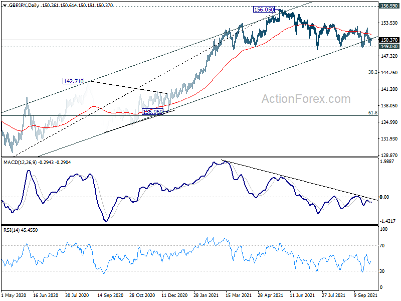 In the bigger picture, rise from 123.94 is seen as the third leg of the pattern from 122.75 (2016 low). The stay above 55 week EMA affirms medium term bullishness. Current rise should now target 61.8% retracement 195.86 (2015 high) to 122.75 at 167.93 next. In any case, outlook will remain bullish as long as 148.93 structural support hold, even in case of deeper pull back.