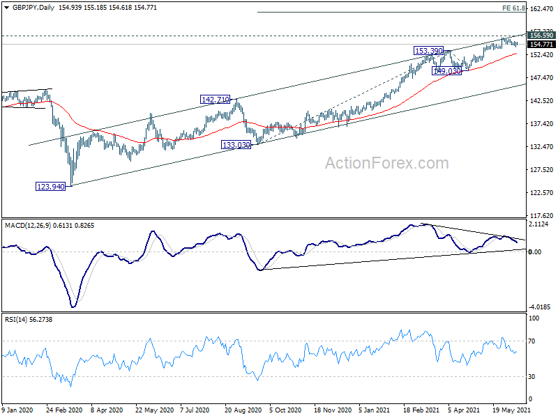 In the bigger picture, rise from 123.94 is seen as the third leg of the pattern from 122.75 (2016 low). Focus is now on 156.59 resistance (2018 high). Sustained break there should confirm long term bullish trend reversal. Next target is 61.8% retracement of 195.86 (2015 high) to 122.75 at 167.93. On the downside, break of 149.03 support is needed to be the first sign of completion of the rise from 123.94. Otherwise, outlook will remain bullish even in case of deep pull back.