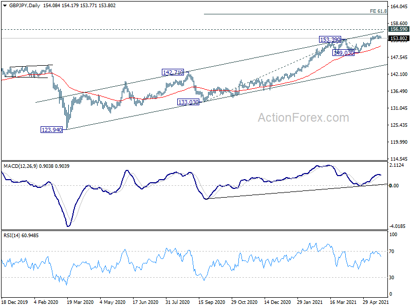 In the bigger picture, rise from 123.94 is seen as the third leg of the pattern from 122.75 (2016 low). Focus is now on 156.59 resistance (2018 high). Sustained break there should confirm long term bullish trend reversal. Next target is 61.8% retracement of 195.86 (2015 high) to 122.75 at 167.93. On the downside, break of 149.03 support is needed to be the first sign of completion of the rise from 123.94. Otherwise, outlook will remain bullish even in case of deep pull back.