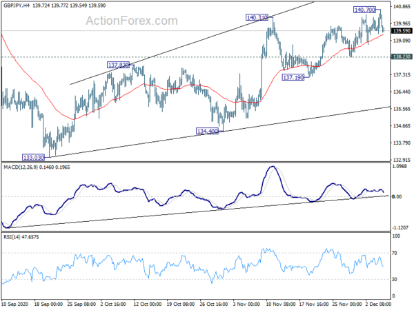 Range trading continues in GBP/JPY and intraday bias remains neutral for the moment. On the upside, firm break of 140.70 will resume the choppy rebound from 133.03 for retesting 141.71 high. On the downside, though, break of 136.78 will turn bias to the downside for 134.40 support first.
