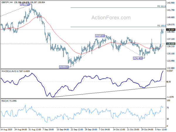 GBP/JPY rebounded strongly last week but failed to take out 140.31 resistance. Near term outlook is mixed up and initial bias remains neutral this week first. On the upside, break of 140.31 will resume whole rebound from 133.03 and target a test on 142.71 high. On the downside, however, break of 137.19 will argue that the pattern from 142.71 is starting another falling leg. Intraday bias will be turned back to the downside for 134.40 support and possibly below.