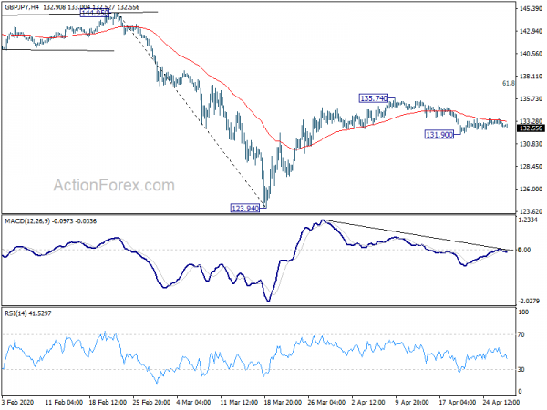 GBP/JPY’s decline resumed last week to close at 129.68. The development affirmed the view that corrective rebound form 123.94 has completed at 135.74. Initial bias stays on the downside this week for 61.8% retracement of 123.94 to 135.74 at 128.44. Firm break there will target a test on 123.94 low. On the upside, above 131.41 minor resistance will turn intraday bias neutral first.