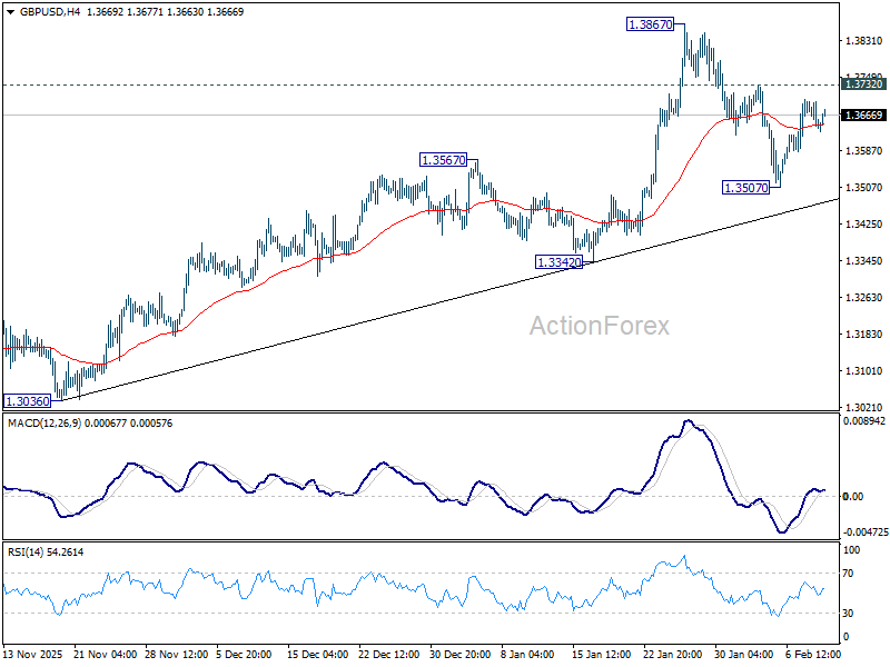No change in GBP/USD's outlook and intraday bias stays neutral . On the upside, firm break of 1.3732 resistance will suggest that pullback from 1.3867 has completed as a correction at 1.3507. Retest of 1.3867 should be seen first. Firm break there will resume larger up trend towards 1.4284 key resistance. On the downside, however, sustained trading below 55 D EMA (now at 1.3505) will raise the chance of larger scale correction, and target 1.3342 support for confirmation.