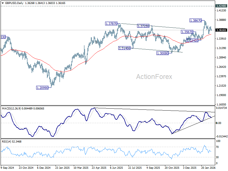 Intraday bias in GBP/USD remains neutral for the moment. On the upside, firm break of 1.3732 resistance will suggest that pullback from 1.3867 has completed as a correction at 1.3507. Retest of 1.3867 should be seen first. Firm break there will resume larger up trend towards 1.4284 key resistance. On the downside, however, sustained trading below 55 D EMA (now at 1.3497) will raise the chance of larger scale correction, and target 1.3342 support for confirmation.