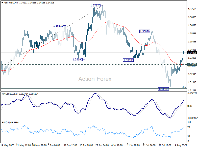 In the bigger picture, up trend from 1.3051 (2022 low) is in progress. Next medium term target is 61.8% projection of 1.0351 to 1.3433 from 1.2099 at 1.4004. Outlook will now stay bullish as long as 55 W EMA (now at 1.3068) holds, even in case of deep pullback.