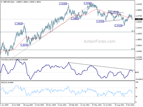 Intraday bias in GBP/USD is turned neutral with current recovery, but further decline is in favor with 1.3708 minor resistance intact. Below 1.3604 will target a test on 1.3410 low. Break there will resume larger decline from 1.4280. On the upside, though, break of 1.3708 minor resistance will turn bias back to the upside for 1.3833 resistance again. Decisive break of 1.3833 will re-affirm the case that corrective fall from 1.4248 has completed at 1.3410 already.