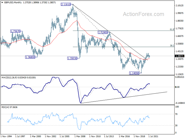 In the bigger picture, as long as 1.3482 resistance turned support holds, we’d still treat price actions from 1.4248 as a corrective move. That is, up trend from 1.1409 (2020 low) is in favor to resume. Decisive break of 1.4376 key resistance (2018 high) would indeed carry long term bullish implications. However, sustained break of 1.3482 will at least bring deeper fall to 38.2% retracement of 1.1409 to 1.4248 at 1.3164, or even further to 61.8% retracement at 1.2493.