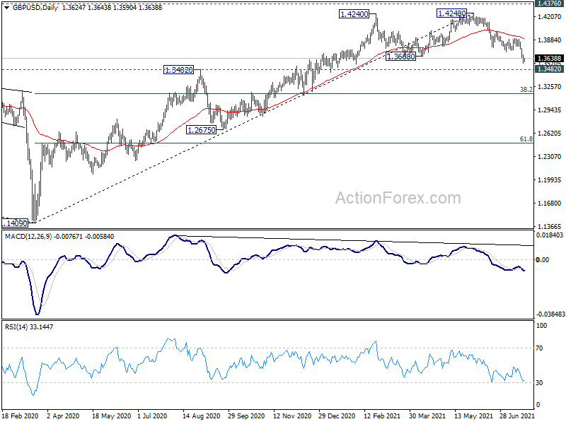 In the bigger picture, as long as 1.3482 resistance turned support holds, up trend from 1.1409 should still continue. Decisive break of 1.4376 resistance will carry larger bullish implications. However, firm break of 1.3482 support will argue that the rise from 1.1409 has completed. GBP/USD would then be seen in another leg of long term range pattern between 1.1409 and 1.4376. Deeper fall could then be seen to 61.8% retracement of 1.1409 to 1.4248 at 1.2493, and even below.