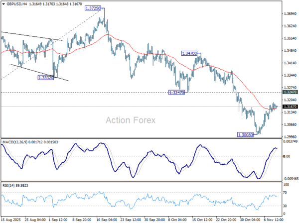 Range trading continues in GBP/USD and intraday bias stays neutral. Further decline is expected as long as 1.3247 support turned resistance holds. Break of 1.3008 will resume the fall from 1.3787, and target 138.2% projection of 1.3787 to 1.3140 from 1.3725 at 1.2831. Nevertheless, firm break of 1.3247 will suggest that fall from 1.3787 has completed as a corrective move already.