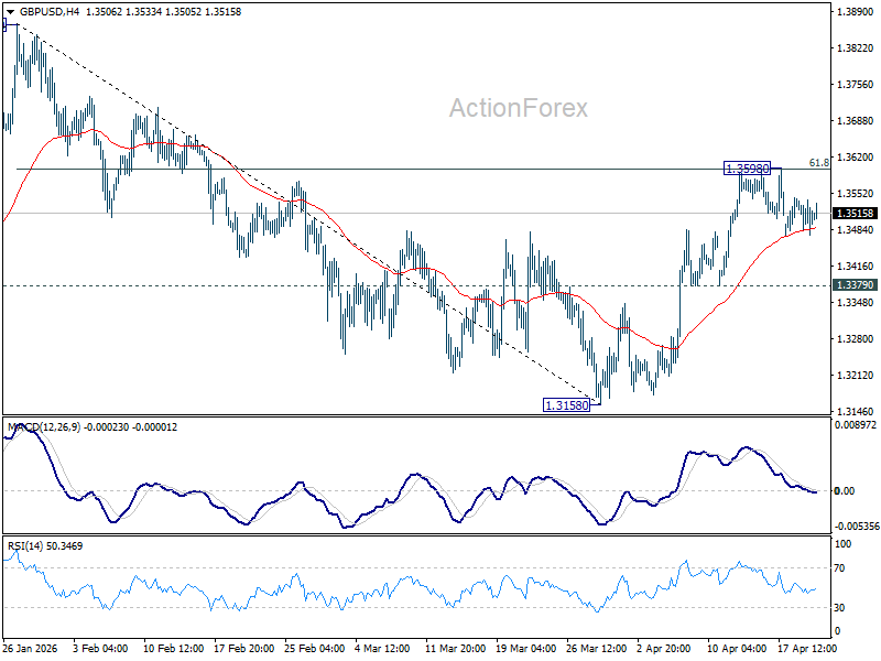 Intraday bias in GBP/USD remains neutral as it's extending consolidations below 1.3598. With 1.3379 support intact, further rise is favor. On the upside, sustained break of 61.8% retracement of 1.3867 to 1.3158 at 1.3596 will pave the way to retest 1.3867 high. However, firm break of 1.3379 will bring deeper fall back to 1.3158 low instead.