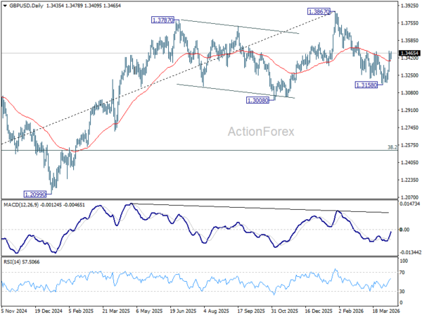 Intraday bias in GBP/USD stays neutral and more consolidations could be seen below 1.3483 temporary top. Fall from 1.3867 could have completed as a correction at 1.3158 already. Above 1.3483 will target 61.8% retracement of 1.3867 to 1.3158 at 1.3596. Firm break there will bring retest of 1.3867 high. Nevertheless, sustained break of 55 4H EMA (now at 1.3337) will dampen this bullish view and bring retest of 1.3158 instead.