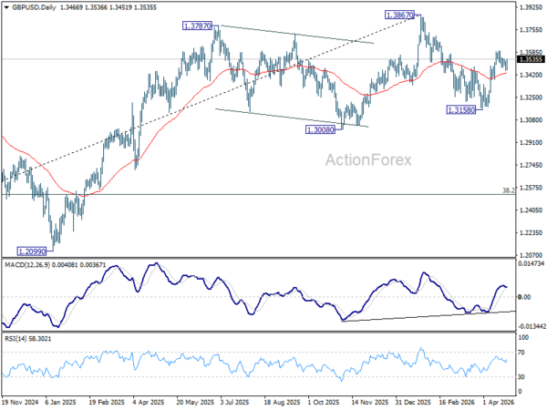 GBP/USD is still bounded in consolidations below 1.3598. Intraday bias bias stays neutral first. Further rise is still in favor with 1.3379 support intact. On the upside, sustained break of 61.8% retracement of 1.3867 to 1.3158 at 1.3596 will pave the way to retest 1.3867 high. However, firm break of 1.3379 will bring deeper fall back to 1.3158 low instead.