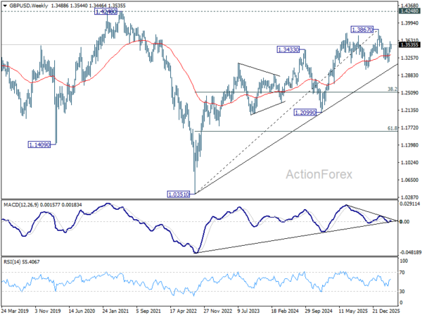 GBP/USD turned into consolidations last week and outlook is unchanged. Initial bias remains neutral this week first. On the upside, firm break of 61.8% retracement of 1.3867 to 1.3158 at 1.3596 will pave the way to retest 1.3867 high. However, break of 1.3379 will bring deeper fall back to 1.3158 low instead.