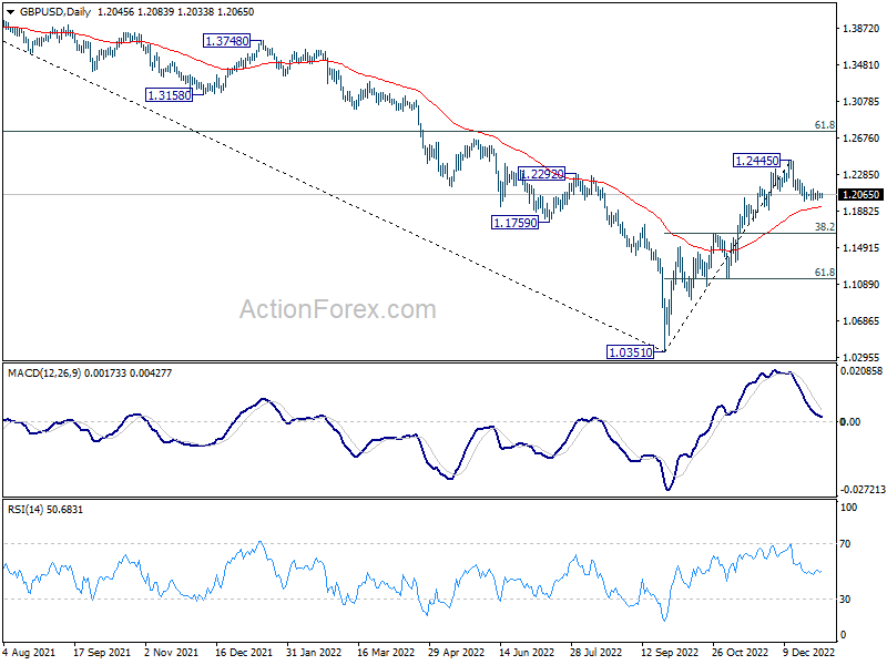 GBP/USD is staying in range above 1.1899 and intraday bias remains neutral first. On the downside, break of 1.1899 and sustained trading below 55 day EMA (now at 1.1938) will target 38.2% retracement of 1.0351 to 1.2445 at 1.1645 next. However, strong rebound from 55 day EMA, followed by break of 1.2124 resistance, will argue that the pull back from 1.2445 has completed, and turn bias back to the upside for retesting this high.
