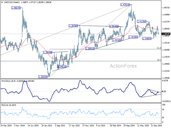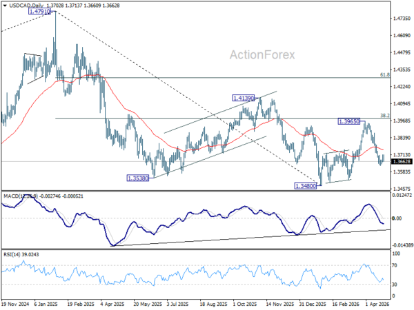 USD/CAD fell to as low as 1.3629 last week but recovered since then. Initial bias remains neutral this week first. On the downside, sustained trading below 61.8% retracement of 1.3480 to 1.3965 at 1.3665 will pave the way to retest 1.3480 low. Nevertheless, break of 1.3729 minor resistance will turn bias back to the upside for stronger rebound first.