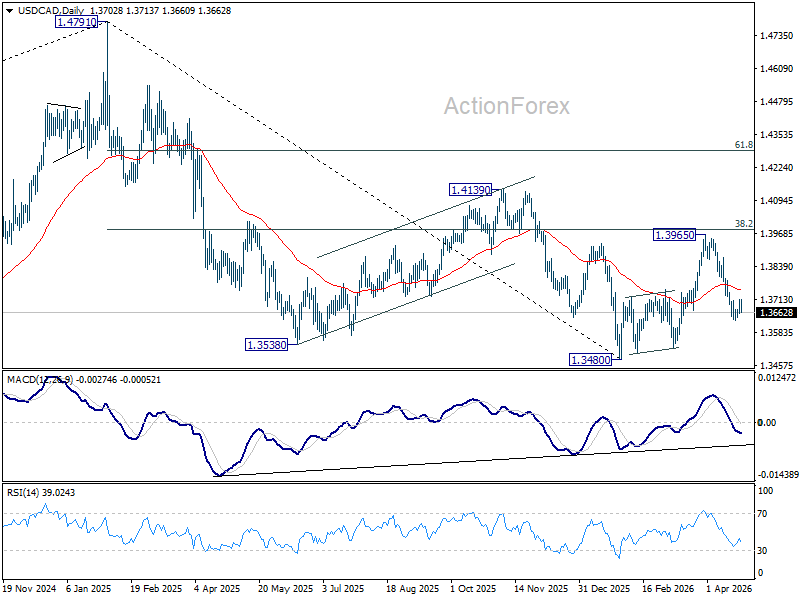 Intraday bias in USD/CAD remains neutral for the moment. Further fall is in favor as long as 1.3787 resistance holds. Sustained trading below 61.8% retracement of 1.3480 to 1.3965 at 1.3665 will pave the way to retest 1.3480 low. However, firm break of 1.3787 will bring stronger rebound back to retest 1.3965 resistance.