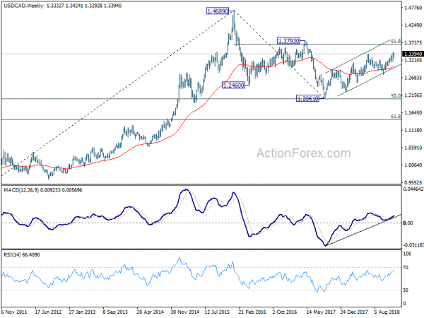 In the bigger picture, up trend from 1.2061 (2017 low) is still in progress and should target 61.8% retracement of 1.4689 (2016 high) to 1.2061 at 1.3685. At this point, the structure is not clearly impulsive yet. Hence, we’d be cautious on topping between 1.3685/3793. But in any case, medium term outlook will stay bullish as long as channel support (now at 1.2993) holds. Sustained break of 1.3793 will pave the way to retest 1.4689 (2015 high).