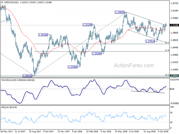 In the bigger picture, current development revives the case that corrective fall from 1.3385 has completed at 1.2781 already. And whole up trend from 1.2061 (2016 low) is ready to resume. Break of 1.3385 will target 61.8% retracement of 1.4689 (2016 high) to 1.2061 at 1.3685. This will now be the favored case as long as 1.2781 support holds.