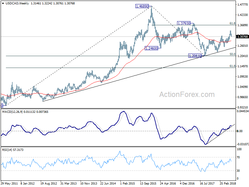 In the bigger picture, as long as channel support (now at 1.2893) holds, we’re holding to the bullish view. That is, fall from 1.4689 (2015 high) has completed at 1.2061, ahead of 50% retracement of 0.9406 (2011 low) to 1.4689 (2015 high) at 1.2048. Further rally should be seen for 61.8% retracement of 1.4689 to 1.2061 at 1.3685 and above. However, sustained break of the channel support will argue that rise from 1.2061 has completed and will bring deeper fall to 1.2526 support to confirm.