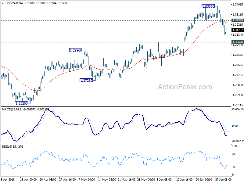 A temporary low is formed at 1.3128 in USD/CAD with 4 hour MACD crossed above signal line. Intraday bias is turned neutral first. While fall from 1.3385 could still extend, we’d expect downside to be contained there to bring rebound. On the upside, above 1.3258 minor resistance will bring retest of 1.3385. However, firm break of 1.3067will bring deeper decline to channel support (now at 1.2839).