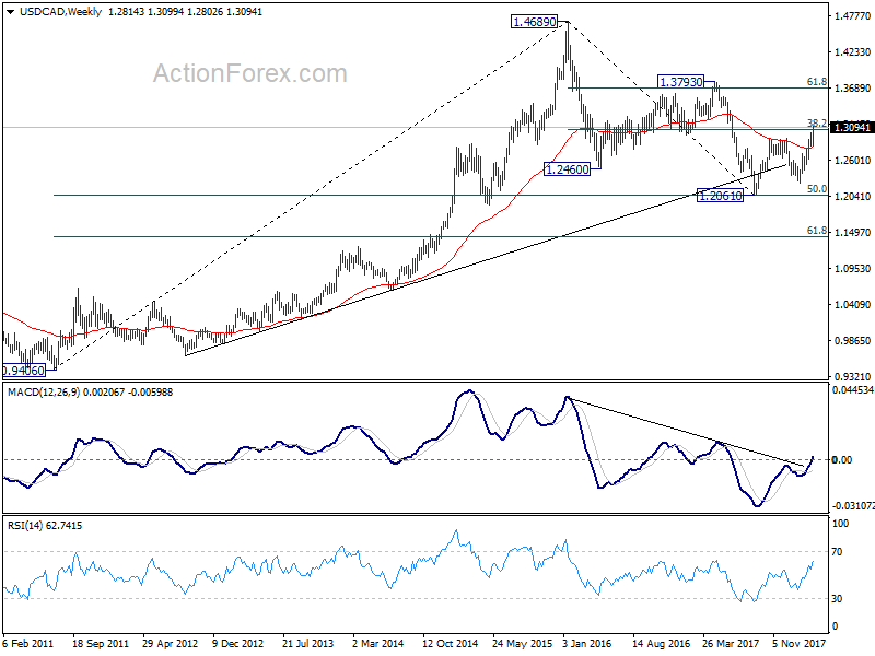 In the bigger picture, we’re favoring the medium term bullish case. That is, larger down trend from 1.4689 has completed at 1.2061 as a correction, drawing support from 50% retracement of 0.9406 (2011 low) to 1.4689 (2015 high) at 1.2048. Sustained break of 38.2% retracement of 1.4689 to 1.2061 at 1.3065 will pave the way to 61.8% retracement at 1.3685. This will be the preferred case now as long as 1.2802 support holds. However, rejection by 1.3065 will argue that price action from 1.2061 is merely a three wave corrective pattern. And 1.2061 will be put back into focus with medium term bearishness revived.