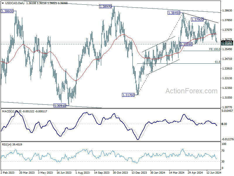 USD/CAD dipped to 1.3588 but recovered after hitting 1.3589 support. Intraday bias remains neutral first. Outlook is unchanged that corrective pattern from 1.3845 could extend. Break of 1.3589 will target 100% projection of 1.3845 to 1.3589 from 1.3790 at 1.3534. Strong support would be seen there to bring rebound. On the upside, above 1.3652 minor resistance will turn bias back to the upside for 1.3790 resistance instead.